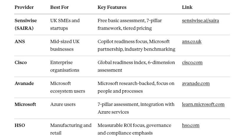 Several organisations offer AI readiness assessments tailored to UK businesses: